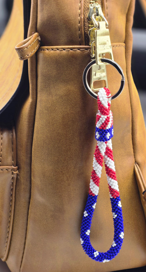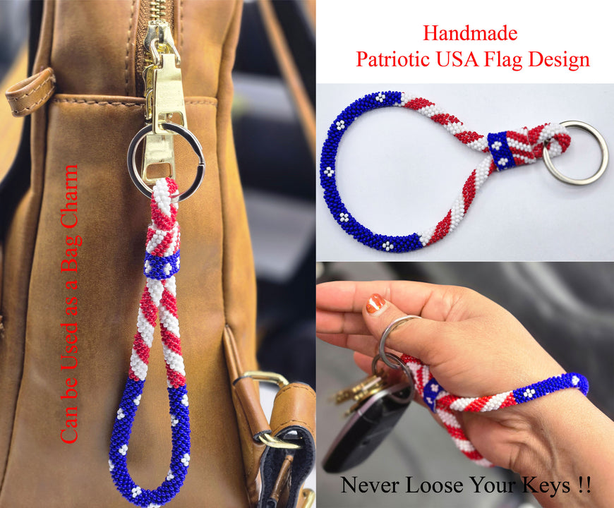 Show off your American pride in a stylish and practical way with this Handmade American Flag Glass Seed Bead Beaded Keychain Bracelet. Made with quality glass seed beads in patriotic red, white, and blue, this wristlet adds charm and convenience to your everyday carry. Its flexible design fits most wrist sizes comfortably, offering a hands-free way to carry your keys—ideal for busy days, errands, travel, or outdoor fun. Whether you're pairing it with your favorite casual outfit or gifting it to someone who loves USA-themed accessories, this keychain bracelet is both functional and fashionable. This can also be used as a bag keychain Charm Accessories. A perfect gift choice for 4th of July celebrations, Mother’s Day, or any occasion where a unique, handmade touch is appreciated. Perfect Gift for Any Occasion - Whether for yourself or a loved one, this car keychain for women makes a thoughtful and practical gift. Ideal for birthdays, Mother’s Day, Valentine’s Day, Thanksgiving, Christmas,Holidays and more, this key chain Bracelet women accessory enhances everyday convenience with charm and elegance.